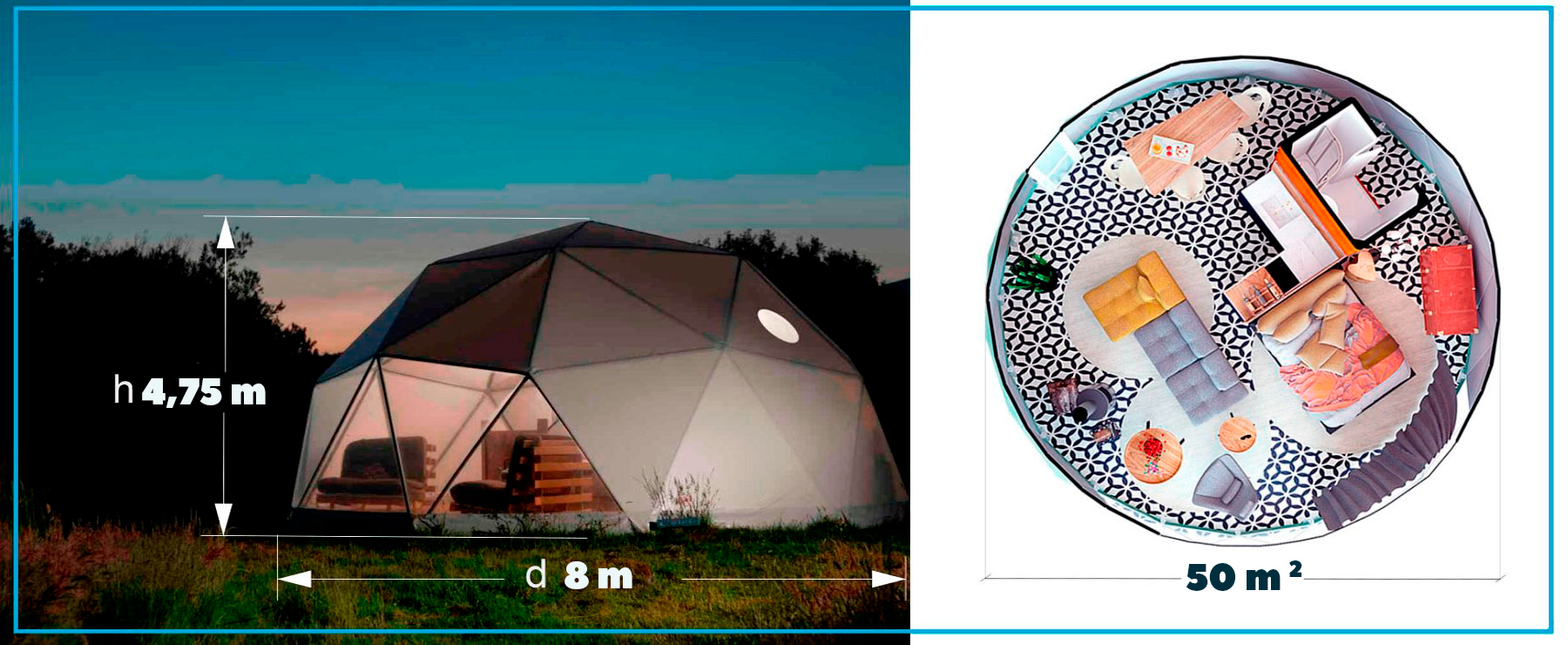 Самый оптимальный купол, идеально подходящий для романтического отдыха на двоих. Отличное решение для туризма! Позволяет за несколько дней создать гостичный номерной фонд на любых землях (на берегу озера, реки, в горах, в лесу).